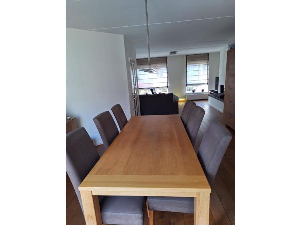 3. Eettafel 2m bij 90cm, inclusief 6 stoffen stoelen