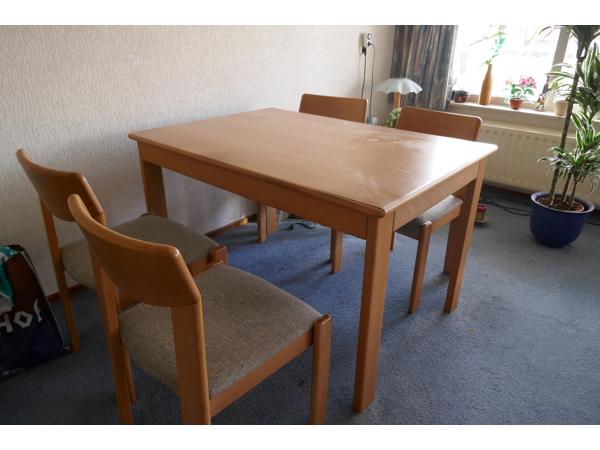 de 4 stoelen zijn ook blank massief eiken met stoffen zitting.