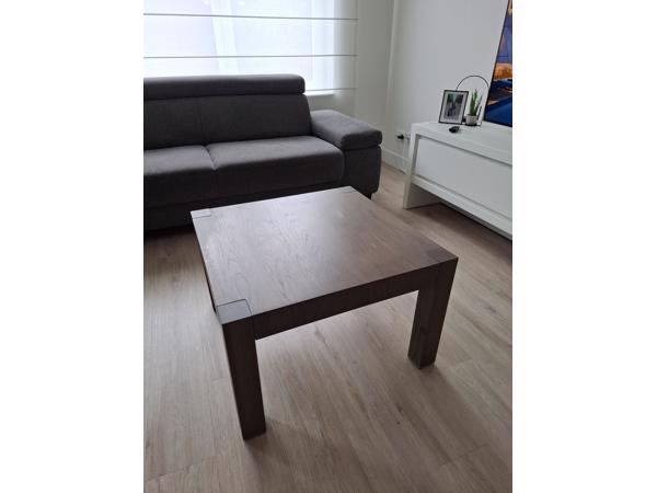 Eetafel met 4 bijbehorende leren stoelen en bijbehorende salontafel. Van massief hout, mat gelakt. Doordat het van massief hout is, kun je het eventueel schuren en in elke gewenste kleur lakken of verven, mocht je dat willen.
