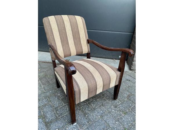 Houten poten en gestreepte stoffe zitting. Zichtbare gebruikssporen op het hout. Makkelijk te verheloen met een schuurpapiertje en wat olie. Afhalen in de avonduren of op zondag.