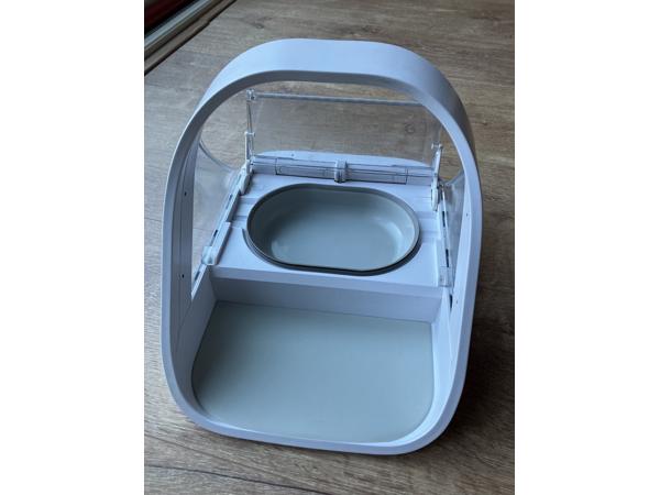 Is handig bij twee huisdieren, waarvan er één een aangepast dieet heeft. Kan gebruikt worden voor nat en droogvoer. Blijft open zolang de kat eronder staat. Er gaan vier C-batterijen in de voederbak. Wordt geleverd zonder batterijen. In principe schoon, maar er zitten nog wat lijmresten van tape aan het plastic. De andere kat was zo slim om zijn kop over de rand te steken, dus moest afgeplakt worden. Af te halen in Delft.