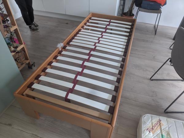 Extra lang houten bed inclusief met lattenbodem, matras en matrasbeschermer, alle met maten 220x90cm. Moet snel weg omdat het nieuwe bed er al staat. Lichte beschadigingen op het hout maar het bed staat nog stevig en is gemakkelijk in elkaar te zetten door de panelen in elkaar te zetten en dan de metalen T-stukken vast te schroeven.