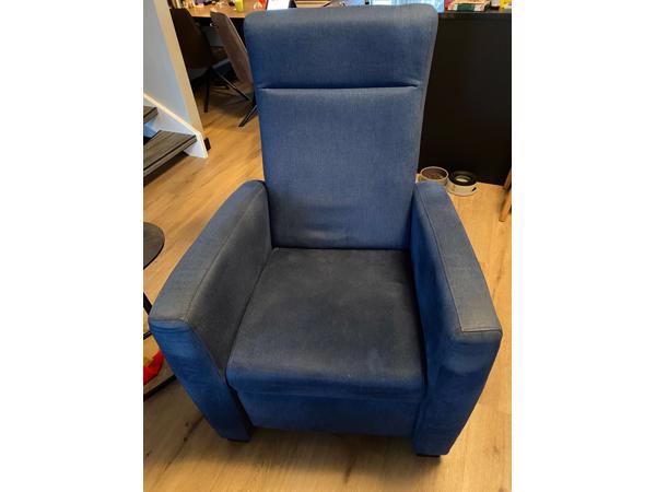Fauteuil met voetensteun, kleur blauw. Functioneert nog prima en de stof is zonder gaten of iets dergelijks.