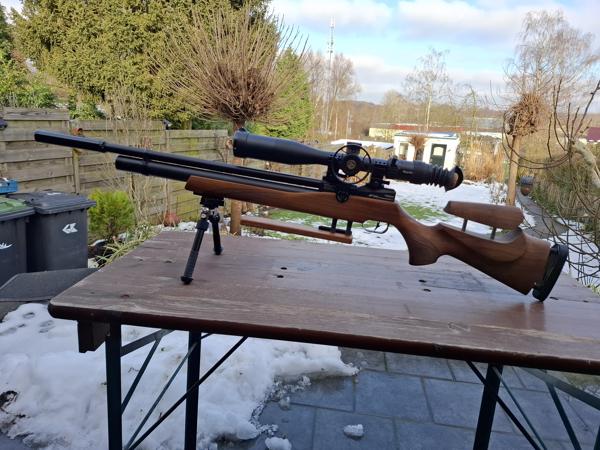 FX dreamline, complete set. Zgan. In kaliber 4,5 mm en 5,5 mm, wisselloop met bijpassend laadventiel. Drie dempers, een voor 4,5 mm twee voor 5,5 mm. Carbon fles gekeurd nov 2020, dus nog zes jaar te vullen, huidige druk 220 ATM, dus enkel optoppen. Magazijnen en enkel laders in beide kalibers. Kolf is verstelbaar in hoogte (laten aanpassen). De buks is ook weer geheel naar origineel om te bouwen. Voorzien van veel accessoires, wegklap-standaard, verhoogde hardsteen kolf, kijker ffp westhunter 4-16 zoom 50mm met parallax-verstelling. Schiet zeer zuiver tot zeker 50 meter. Nieuw gekocht bij Krale sept 2020. Info 06 22299887.
