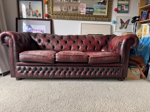 Prachtige, gebruikte Chesterfield bank. Een echte eyecatcher met een mooie patina op het leer, wat de bank een authentieke uitstraling geeft. De bank heeft wel wat gebruikssporen op de kussens, maar is perfect voor wie op zoek is naar een karakteristiek meubelstuk dat wat liefde kan gebruiken. Formaat:1,95cm lang x 100cm Diep x 80cm hoog Let op: koper moet even helpen met het tillen van de bank van de 1e verdieping vanaf het balkon.