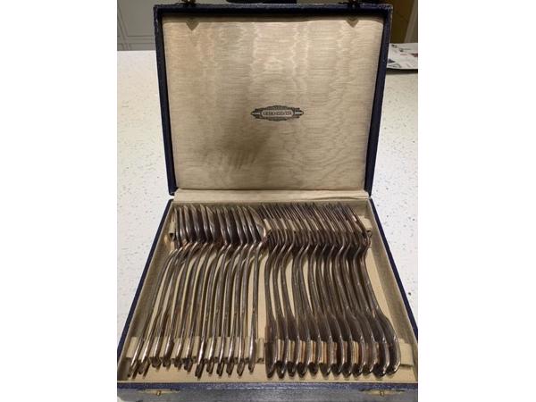Antiek schitterende verzilverde set van 24 delen / 12 couverts (lepels en vorken) voor het merk Gero geproduceerd door Chhristofle en Charles Haplhen. Twee merktekens in zowel de lepels als de vorken van Christofle 60 en Alfenide. Versieringen op de voor- en achterkanten met kransjes, linten en blad. Vermoedelijke productiedatum tussen 1912 en 1940. In originele cassette die uiteraard gebruiksporen heeft.