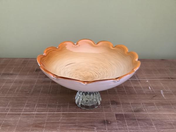 -Binnenkant is amberkleurig glas, gedraaid, met subtiele sporen van goud en enkele spikkels, en kleine luchtbellen. Aan de buitenkant van de schaal is wit glas. Om het amberkleurig en wit glas is een laag van helder glas. De randen zijn geschulpt. De schaal is aangebracht op de voet gemaakt van helder glas, geschulpt en met streepjes, enkele luchtbellen.