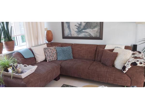 Er zitten beschadigingen op en aan deze bank. De voering onder de zittingen is weg ( oorzaak katten) in de hoek zit er een naadje los en het korte gedeelte is enigzins verkleurd door de zon. Maar zit en ligt nog steeds super lekker! En kan absoluut nog wel een periode mee. Inclusief 3 kussens in dezelfde kleur.