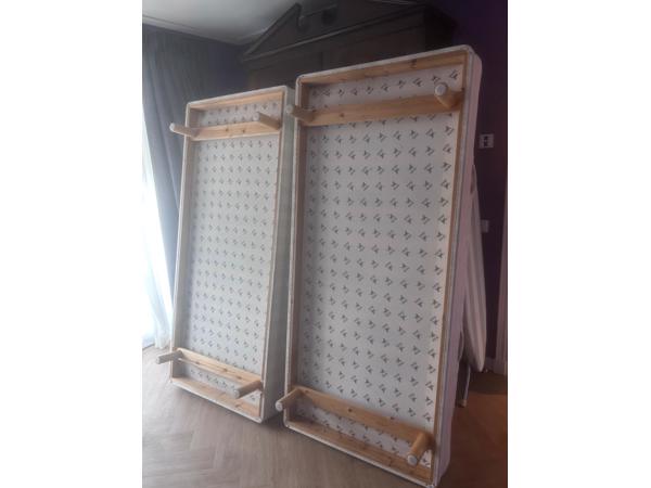 Specificaties: Merk: Hästens (natuurlijke materialen: paardenhaar, wol, katoen). Afmeting: 180 x 200 cm. Opbouw: 2 aparte boxspring-delen (makkelijk te vervoeren) + 1 groot tweepersoonsmatras (180x200). Staat: Zeer goed, geen kuilvorming of vlekken.