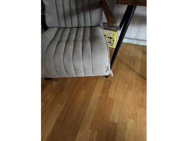 Grijs bekleed, metaal frame met houten leuning. Bekleding gebruikt door katten
