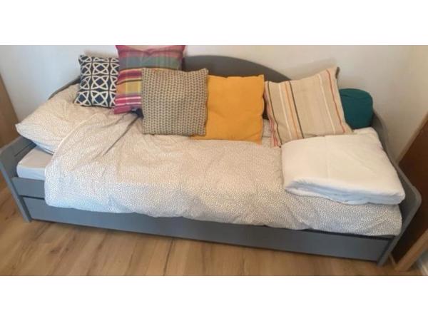 Gratis grijze bedbank, te gebruiken als bank maar ook leuk als kinderbed. Heeft een handige opberglade onderin. Er zijn een paar kleine beschadigingen aan de lak, maar met een nieuw verflaagje is hij weer zo goed als nieuw! Gratis op te halen, reeds gedemonteerd voor vervoer!