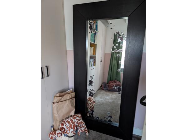 Grote spiegel, buitenmaat inclusief rand 190x94cm. Niets mis mee, ooit bij Ikea gekocht. Zwarte houten buitenrand.