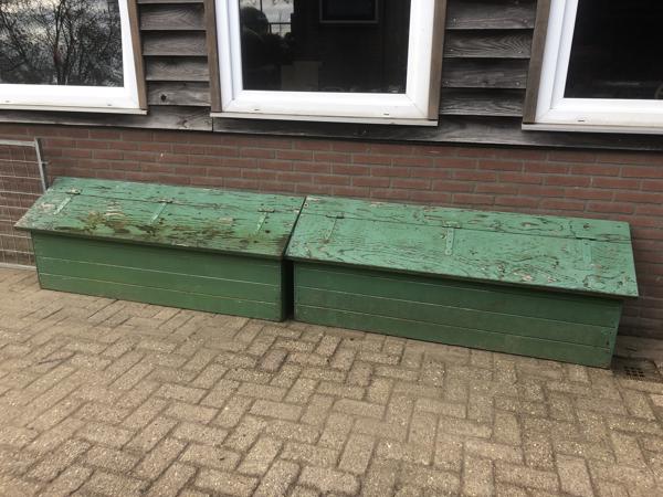 Twee grote voer bakken ,hangen aan buitenkant hok, dieren eten binnen,