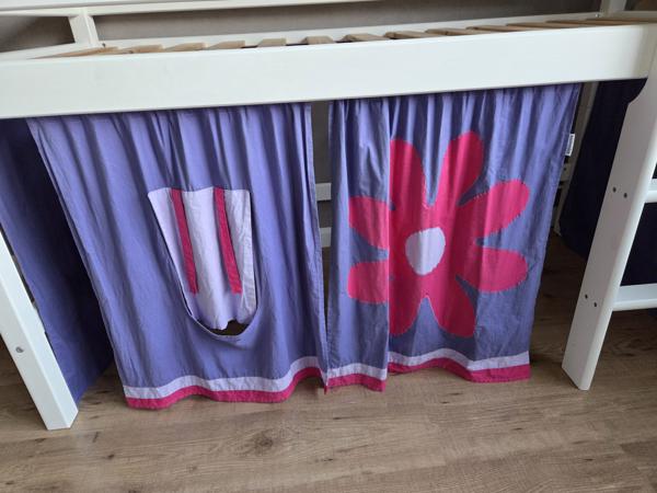 Witte halfhoogslaper met bed afmeting 160x70 cm. De lattenbodem bevindt zich op ongeveer 78 cm hoogte. Het bed is een half jaar geleden opnieuw wit geschilderd. De totale hoogte is ongeveer 105 cm.