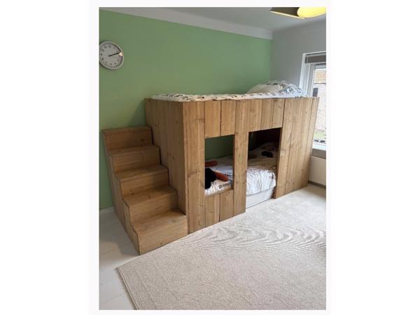 Halfhoogslaper met speelruimte onder, of juist extra bed. Plankje zowel boven als onder voor boeken. Trapelement los er tegenaan te schuiven dus op veel plekken mogelijk. 1.35 hoog. Matras 90x120 of 80x 120.