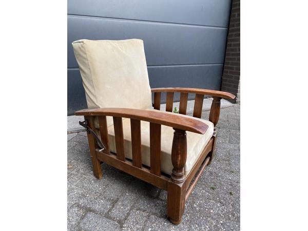 Stof: licht beige rib stof. Is er af te halen en uit te wassen. Massief houten stoel. Er zitten krassen op door gebruik. Makkelijk te herstellen door een schuurpapiertje en wat olie. Rugleuning is verstelbaar. Stevige zit. Afhalen in de avonduren of op zondag.