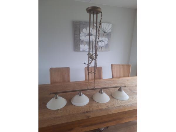 Mooie hanglamp met vier glazen kappen, ideaal voor boven een eettafel. De lamp heeft een bronskleurige afwerking en geeft sfeervol dimbaar licht. De kappen zijn van melkglas en zorgen voor een zachte lichtverspreiding. De lamp is gebruikt, maar in goede staat en werkt perfect. Een stijlvolle toevoeging aan elk interieur.