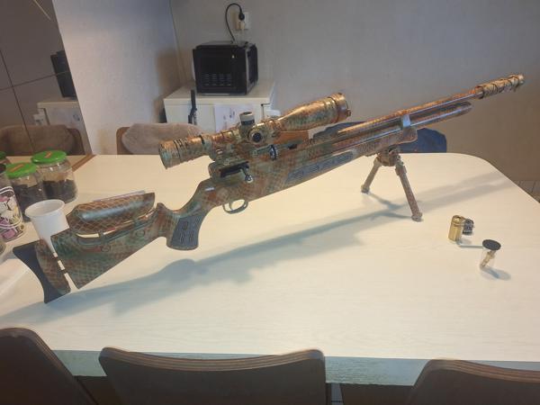 Mooie en goed schietende buks in 6.35 mm, met atlas kloon bipod en T-eagle kijker op tweedelige mountset, 4-16×44 SFIR met sidefocus en sunshade met flip up caps. De drukbuis zat wat losser omdat er een rubber uit was, buks lekt absoluut niet, en rubber is vervangen dus alles zit weer vast. Ontluchtingsset zit er bij en vulnippel met 3 magazijnen. Gemeten schiet de buks 279 mtr. sec. Niet gereguleerd. bipod is een atlas kloontje, werkt prima. Buks en kijker met demper en bipod zijn in camokleur gespoten, dit is erg netjes gedaan door vorige eigenaar.