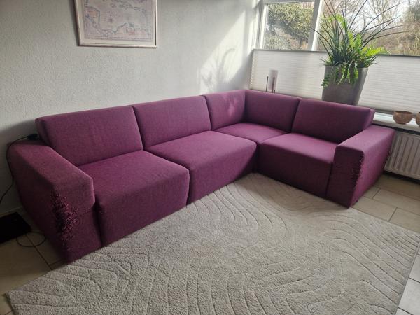 4 delige paarse hoekbank met leuning aan beide kanten, om heerlijk op te zitten of liggen. Vulling is nog steeds goed. Leuningen zijn beschadigd door de kat. Is af te dekken met bijvoorbeeld een doek. Geen losse kussens. Afzonderlijke delen klikken gemakkelijk in elkaar. Alleen als geheel af te halen. Afmeting 324x188 cm