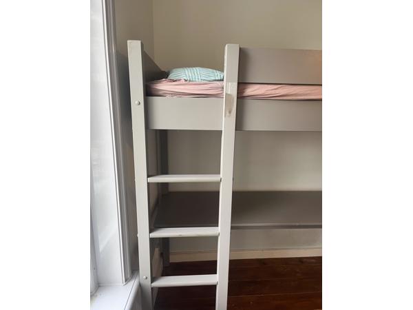 Buitenafmetingen: lengte: 207,5 x breedte: (inclusief trap) 100,5 x hoogte: 180,0 cm Ladder: recht, met open treden. Materiaal: Grenenhout en MDF Kleur: Grijs Matras inbegrepen: nee Maximale dikte matras: 15cm (hoger niet toegestaan ivm veiligheid) Vervaardigd in Europa