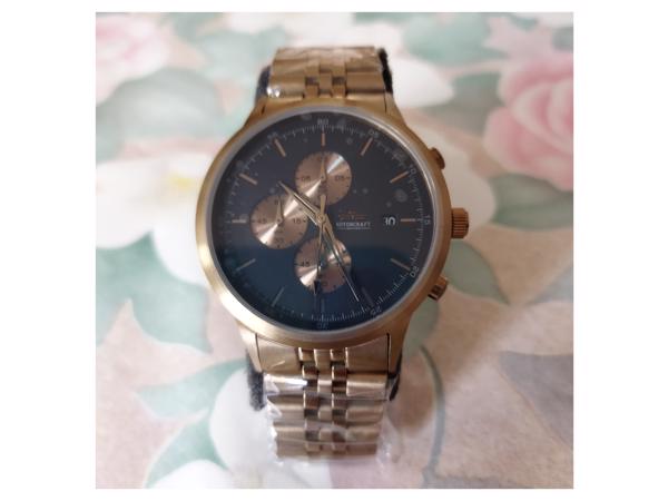 Zwarte wijzerplaat met bronzen accenten. Bronskleurige band en kast.
