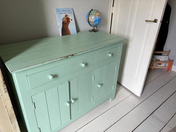 Houten commode, twee lades, twee kastjes met plank. Met een lik verf staat hij weer prachtig in een nieuw babykamertje.