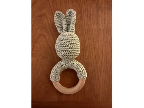 Houten konijn rammelaar groen gebreid