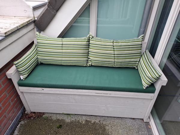Wit gebeitst houten tuinbankje (als bouwpakket) met opbergruimte onder de zitting. Het bankje heeft wel veel TLC nodig. Je krijgt er eventueel een pot witte beits bij.