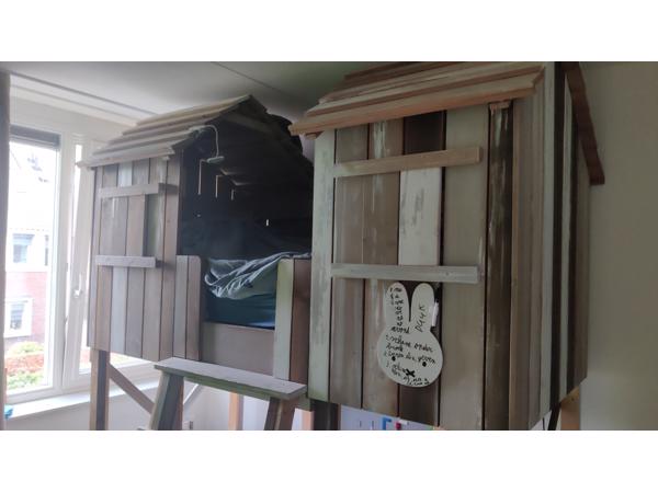 Huisjesbed al gedemonteerd. Gebruikte staat, maar nog goed. Her en der wat beschadigd, maar doet niet af aan werking. Met lattenbodem. Zonder matras.