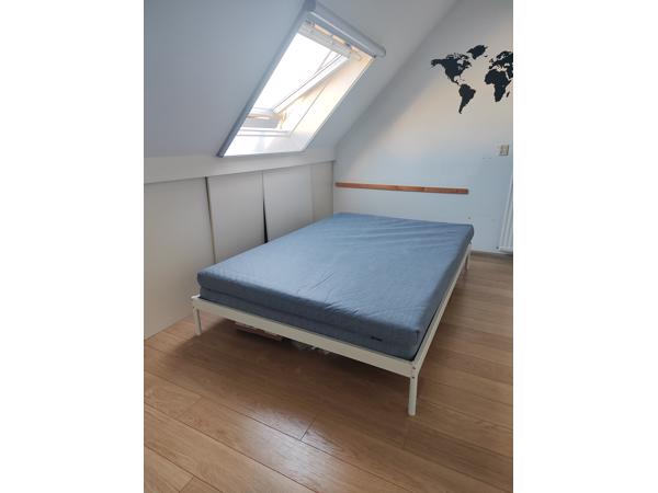I am offering this minimalistic IKEA bed frame and two mattresses as I am moving and don't need them anymore. I have slept on it for 6 months and am sad to say that no nasty stuff has happened on there so the mattrasses are clean and so is the bed (I am no pig :) Specifications and original prices: VEVELSTAD white bed frame 140x200, white, original price €89.95 AGONTES foam mattrass 140x200, original price €59.00 per one (I got two, so €118.00 for both). I don't have a car to transport it but I can make sure do dismantle it and package it into its original state + help with setting it up. The pick up spot is located in Gouda Goverwelle.