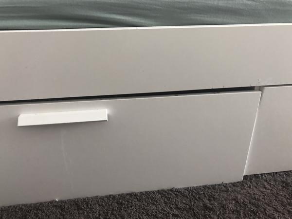 Bij 1 van de 4 lades moet de ophanging/rolsysteem van de lade gemaakt worden (Zie foto). Lade kan wel gewoon onder het bed staan en ook het bed is gewoon volledig stevig ondanks dit mankementje.