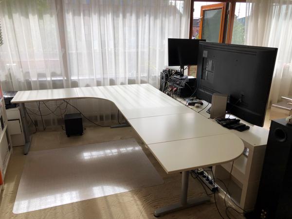 Het bureau bestaat uit vier delen (1 hoekstuk, 2 verlengstukken, 1 afgerond eindstuk) en is voorzien van simpele IKEA kabelgoten.