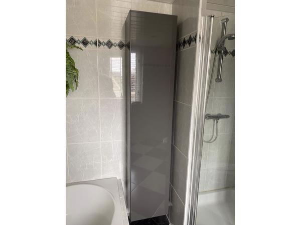 Ruime opberger met zachtsluitende deur.De deur kan met de opening naar rechts of links worden gemonteerd. Incl. handgreep en scharnieren. Incl. 1 vaste en 5 verstelbare planken, waarvan 3 van glas.