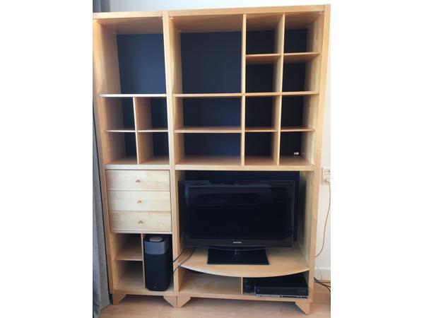 Ikea kubist wandkast 150x205x40 cm, met blauwe achterwand, met enkele gaatjes vanwege doorvoer TV kabel. 1 deel drie lades. TV gedeelte nu 90x65, maar dat is aan te passen. Zelf uit elkaar halen!!