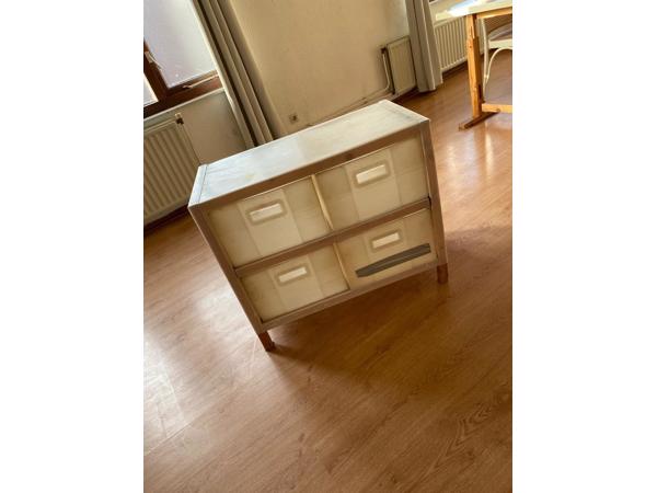 Ladekast van IKEA (niet meer nieuw verkrijgbaar). De basis is van hout en de lades zelf zijn van een soort plastic. Hij is zeker gebruikt en heeft beschadigingen, maar kan nog een rondje mee.