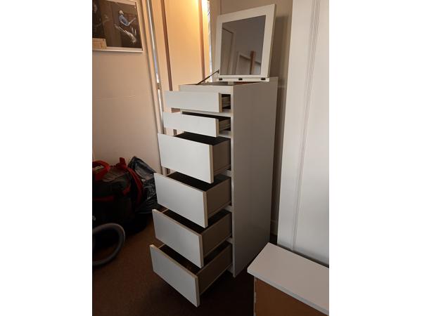 Kast is 40 cm breed, 123 cm hoog en 50 cm diep Kast heeft 6 lades - 2 kleine en 4 grote - bovenkant is een klep met daarin een spiegel