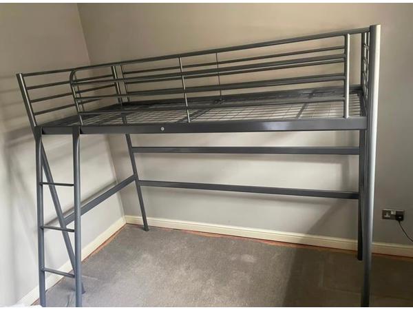 Grijze ikea svarta hoogslaper eenpersoonsbed. Het frame is 208*97*186cm Het bedframe is 145cm van de grond af. Eventueel 200*90 matras. Het is gedemonteerd en klaar om opgehaald te worden.