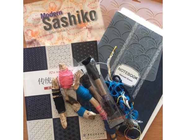 Een set Sashiko spullen: garen, boeken, en een patronen-notebook. 1 Sashiko template: de zee (golven).Hiermee kun je met Sashiko aan de slag: pak een oude spijkerbroek, knip daar lappen eruit en borduur daar decoratieve Sashiko patronen op.