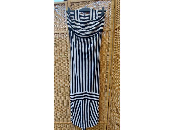 V-446 Aparte jurk van Sao Paulo in gestreept zwart/wit Als je op zoek bent naar iets aparts dan heb je t hier gevonden! Sluit achter met rits en het bovenste gedeelte van het achterpand is gesmokt voor een mooie pasvorm Jurk is gevoerd