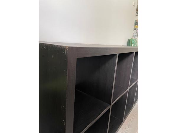 Zwarte Kallax kast met 8 vakken. Horizontaal of verticaal te plaatsen. Gebruikersporen zichtbaar van het schuiven over de vloer. Als je die kant naar de vloer en/of muur zet, kan die nog prima 1-2 jaartjes mee!
