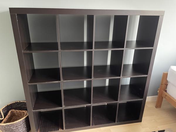 Kallax kast bruin, aan de zijkant zit een beschadiging en stickers maar misschien kan iemand hem nog gebruiken?