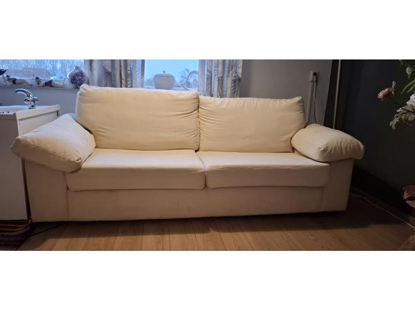 - Bank/salon 3-zits beige (L: 220cm, Diepte: 105cm, Afstand zit-vloer: 40cm). Stof is wasbaar.