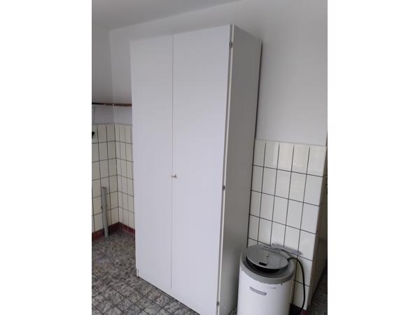 Kast met legplanken en deuren. Geplastificeerd plaatmateriaal. Wit.