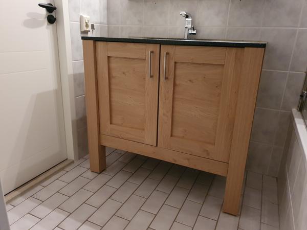 Beschrijving Badkamermeubel: Licht eiken kleur met antraciet granieten blad 100 cm breed 54 cm diep 92 cm hoog Inclusief kraan Wit keramieken verzonken waskom: 45 cm breed 35 cm diep Spiegel: 100 cm breed 78 cm hoog plankje 12 cm diep Inclusief verlichting Afgezien van een enkel miniem putje in de waskom, is alles onbeschadigd