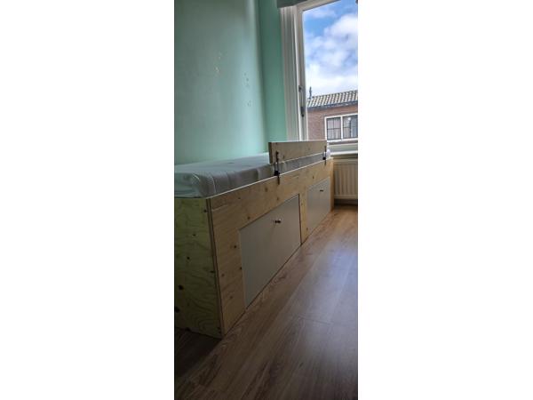 Perfect bed met (verwijderbare) uitvalbescherming en 2 grote lades voor in een kleine kamer. Matras/lattenbodem maat is 200x70 cm. Matras is gebruikt maar is schoon. Ik heb het bed zelf gemaakt van blank gelakte multiplex en wit gelakte mdf. Door een interne verhuizing heeft mijn zoon van 9 deze niet meer nodig. Prijs is inclusief lattenbodem en matras.