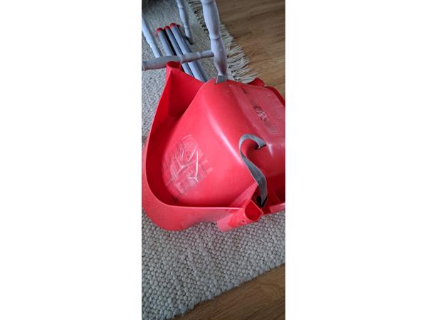 Kinderstoel, kunstof, rood, veiligheidsriempje grijs, kliksysteem zwart.