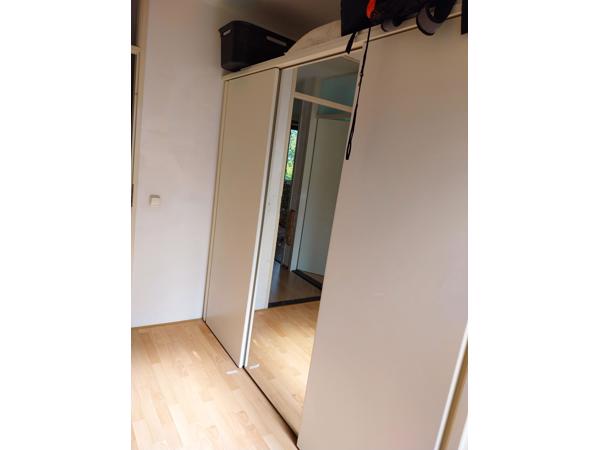Grote kledingkast. Bestaat uit 3 compartimenten met schuifdeuren. Middelste deur is volledig spiegel. Linker en middelste deel hebben beide 4 planken, recht heeft een hanggedeelte en 1 plank bovenin. Afmeting: 160x200x55 Moet weg voor 2 september