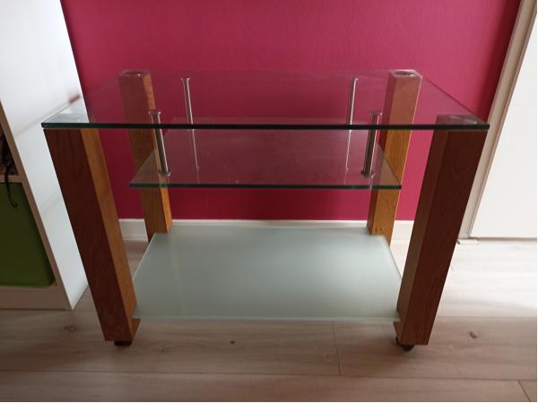 Kleine trolley met twee glazen bladen, waarvan het bovenste met een klein onderblad. Poten zijn van hout, waarschijnlijk teakhout, maar dat is niet zeker. Afmetingen zijn 80x45x58 cm (lxbxh).
