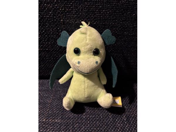 Knuffel van een kleine lichtgroene draak met donkergroene vleugels en oren.