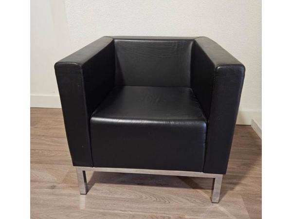 De fauteuil op de afbeelding is een Lamm Polo designfauteuil in zwart leer, ontworpen door R&D Lamm. Dit model staat bekend om zijn strakke, moderne en kubusvormige ontwerp, gecombineerd met comfort.